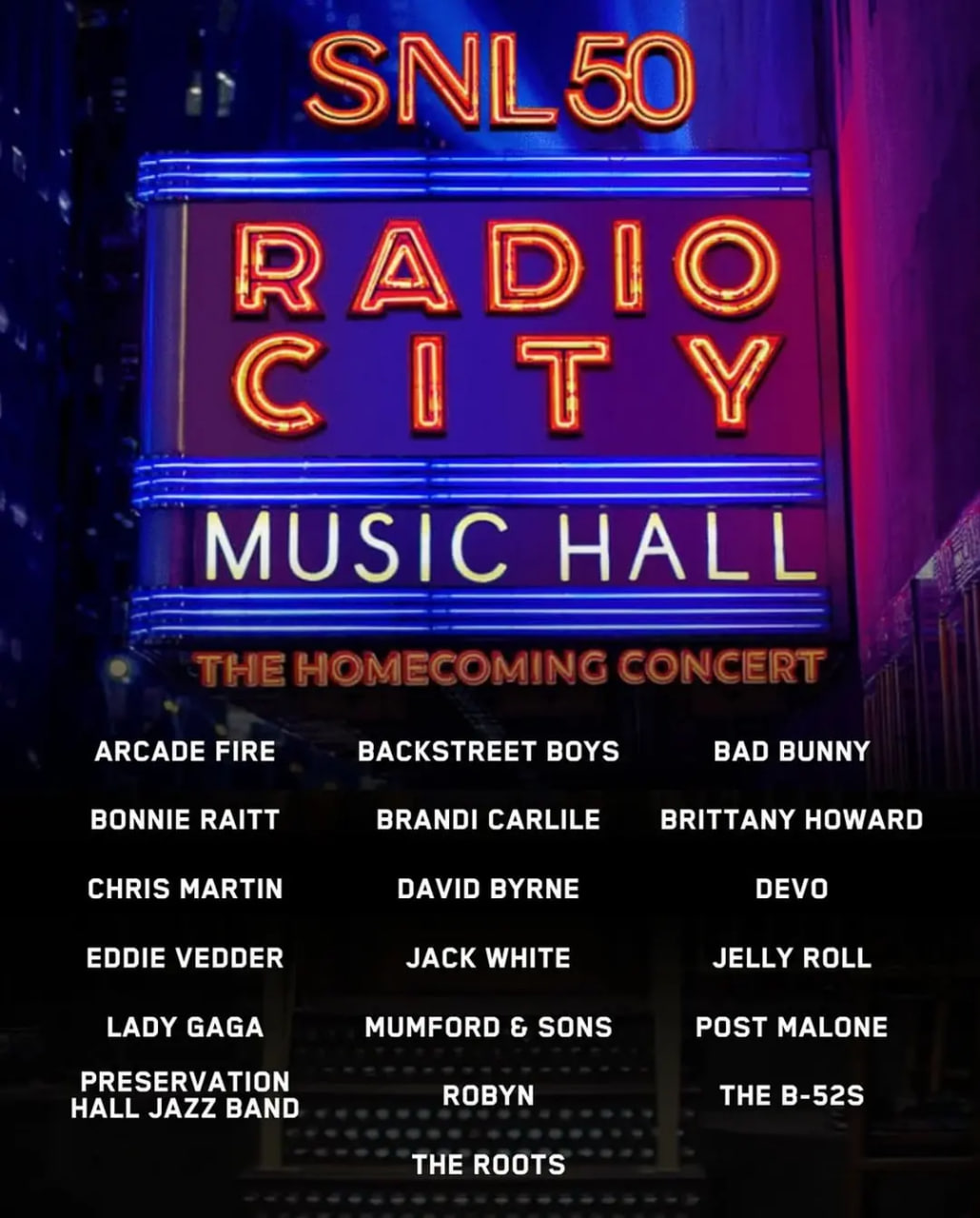 - 主演:吉米·法伦,Lady,Gaga,安迪·萨姆伯格,大卫·伯恩,雪儿,麦莉·赛勒斯,波兹·马龙,拱廊之火乐队,罗宾,坏痞兔